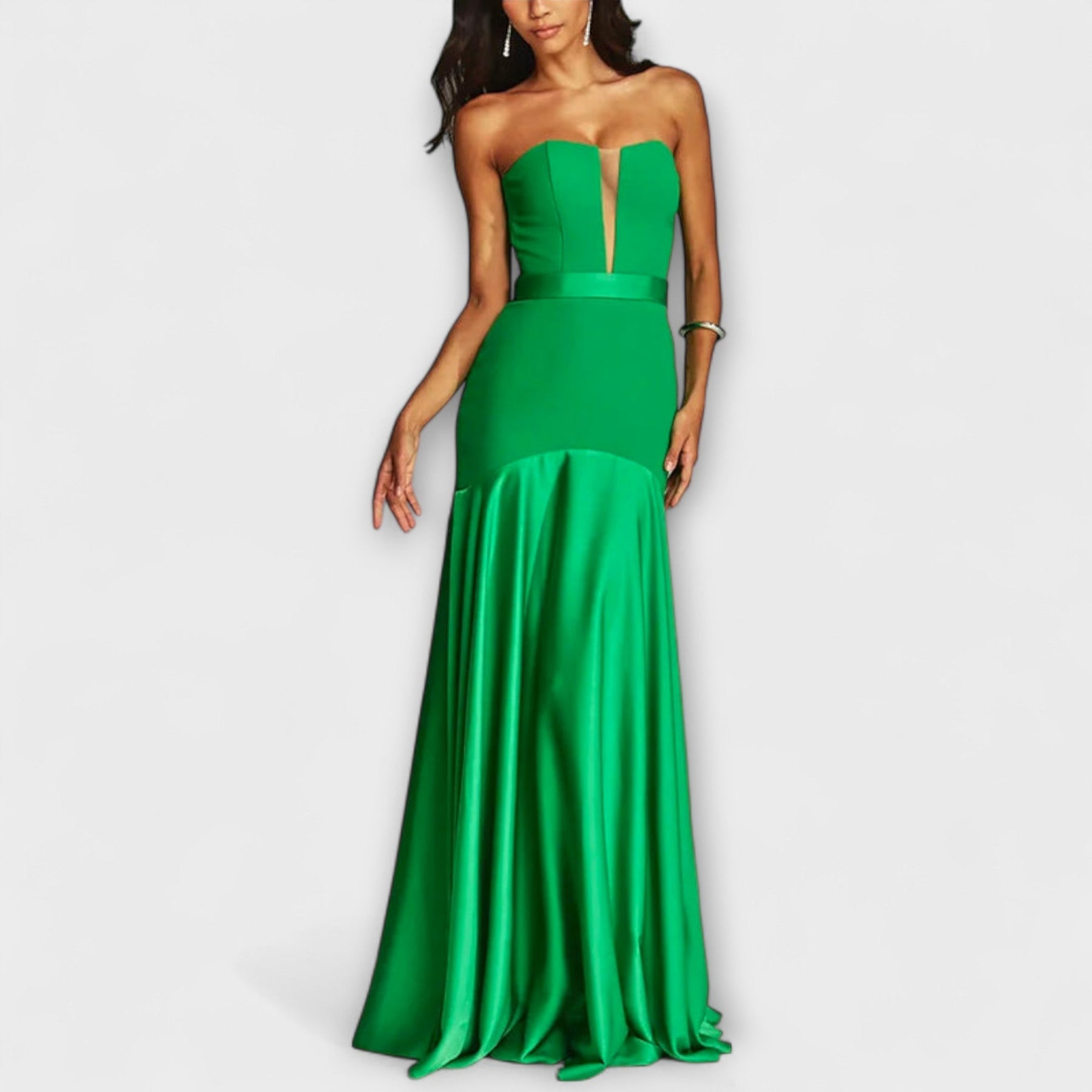 Aumenta tu estilo con nuestro impresionante vestido hasta el tobillo, diseñado para hacer una declaración en cada fiesta. Hecho de poliéster de alta calidad, este vestido cuenta con un elegante diseño sin hombros y un profundo escote en V que añade un toque de elegancia a tu look.