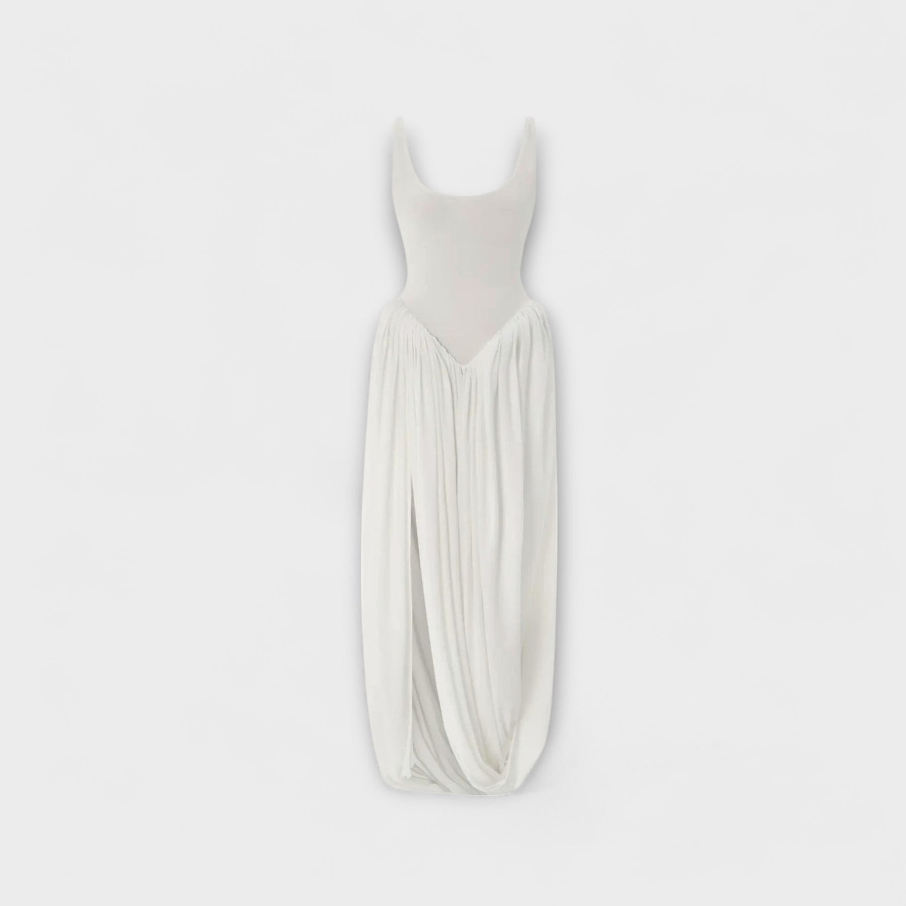 Descubre nuestro vestido maxi drapeado en blanco, una pieza imprescindible para tu guardarropa. Con una falda escultural y una abertura lateral, este vestido combina elegancia y modernidad.